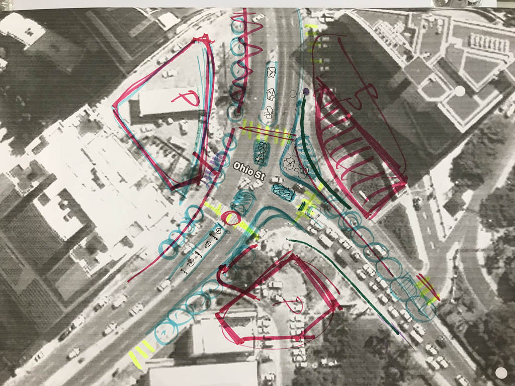 La primera actividad que realizamos durante la Cumbre fue un taller con participantes de cuatro continentes para rediseñar un cruce en la ciudad. Esto implicó visitar el cruce y valorar sus características, para después reunirse en grupos para desarrollar propuestas. Las cuatro propuestas se entregaron al gobierno de la ciudad para que las evalúen en el desarrollo de su próximo corredor de transporte masivo.