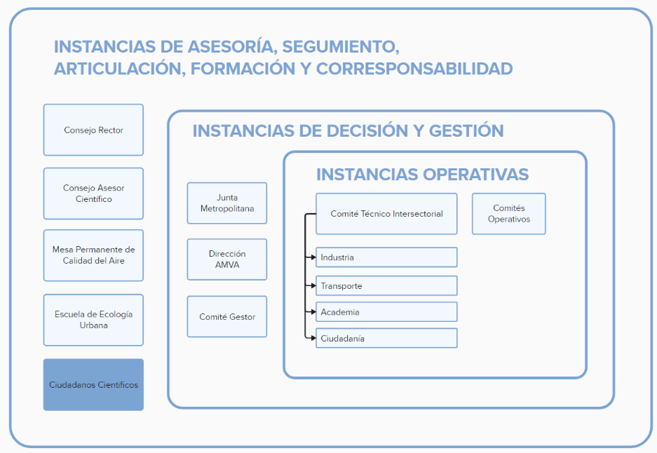Además, el programa de Ciudadanos científicos, según Resolución Metropolitana 334 de 2019, hace parte de las instancias de asesoría, seguimiento, articulación, formación y corresponsabilidad (Ver Fig. 1) del Plan Integral para la Gestión de la Calidad del Aire (PIGECA), una ruta diseñada para enfrentar los problemas asociados a la contaminación atmosférica en el valle y cuyo objetivo es el de “mejorar progresivamente la calidad del aire del Área Metropolitana del Valle de Aburrá, para salvaguardar la salud pública y proteger el ambiente, así como para elevar el bienestar social y propiciar un desarrollo metropolitano sostenible”.