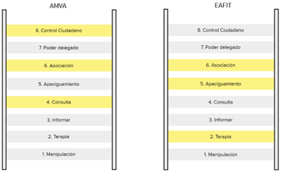 En las sesiones de trabajo llevadas a cabo con ambos equipos (AMVA – SIATA) se explicó inicialmente a las personas participantes en qué consistían los peldaños de participación sin dar sus definiciones, de esta manera se abrió la conversación sobre los significados reales de los peldaños de participación para posteriormente reflexionar junto a los equipos de trabajo las posiciones en las que se encontraba la participación ciudadana.