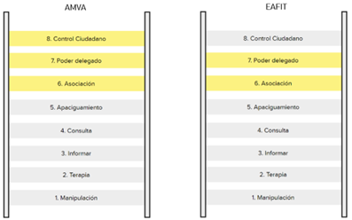 Según los resultados previos a la explicación de los conceptos se pudo evidenciar que EAFIT, a diferencia del AMVA, ubicó sus expectativas en peldaños de participación simbólica y de no participación. Estos resultados están asociados a las percepciones que tenían las personas integrantes de los equipos sobre la participación ciudadana en el esquema de gobernanza de calidad del aire (PIGECA).