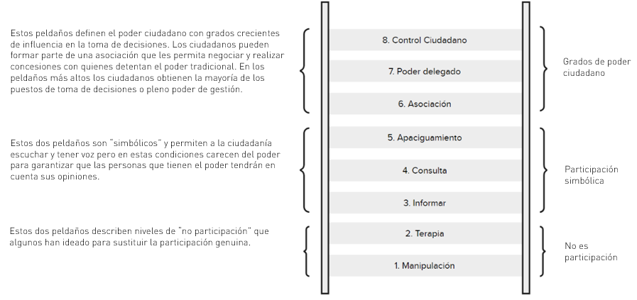 En cuanto a la “escalera de participación”, esta ofrece la posibilidad de realizar un análisis de la participación ciudadana “en el que cada peldaño corresponde al grado de poder de los ciudadanos para determinar un plan o programa”.